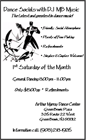 We host Ballroom Dance Socials at the Arthur Murray Studio in Green Brook N.J., every first Saturday of the month. Check out our flyer!